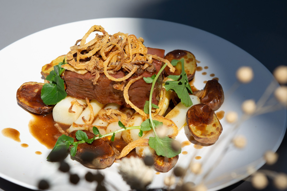 gekonfijte aardappel, seizoensgroenten en rozemarijn-tijmjus - Mals varkensvlees en sucade