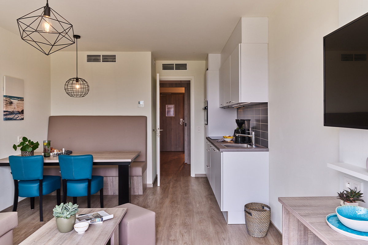 Ook in de residentie van Holiday Suites amuseer je je ten top! De knusse suites zijn uitgerust met heerlijke bedden, comfortabele badkamers en volledige keukens, waardoor je kan kiezen of je uiteten gaat of zelf je prakje kookt.