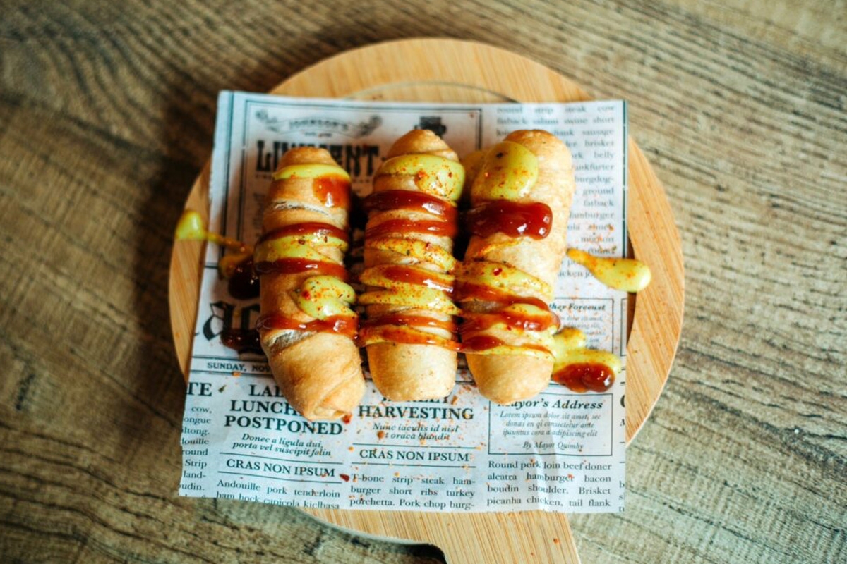De pasta's worden geserveerd met brood en geraspte kaas. De burgers worden geserveerd met zoete aardappelfrietjes en mayonaise