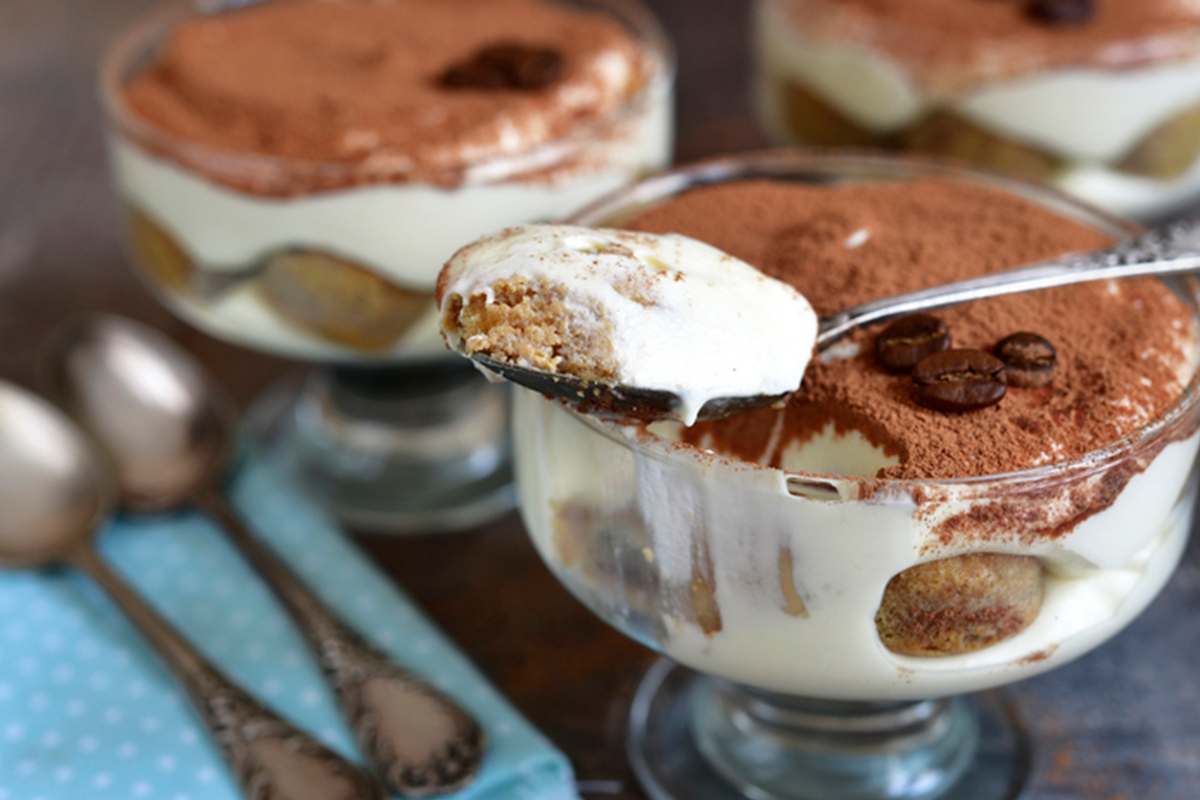 - Copa tiramisu – tiramisu-ijs, koffiesaus en cake, bestrooid met cacaopoeder
