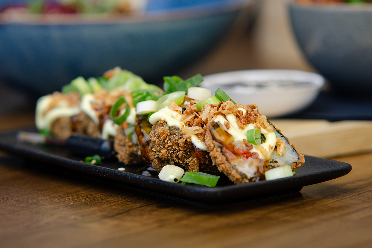 - 6 krokante sushi | edamame mousse | Japanse omelet | soja | wasabimayonaise