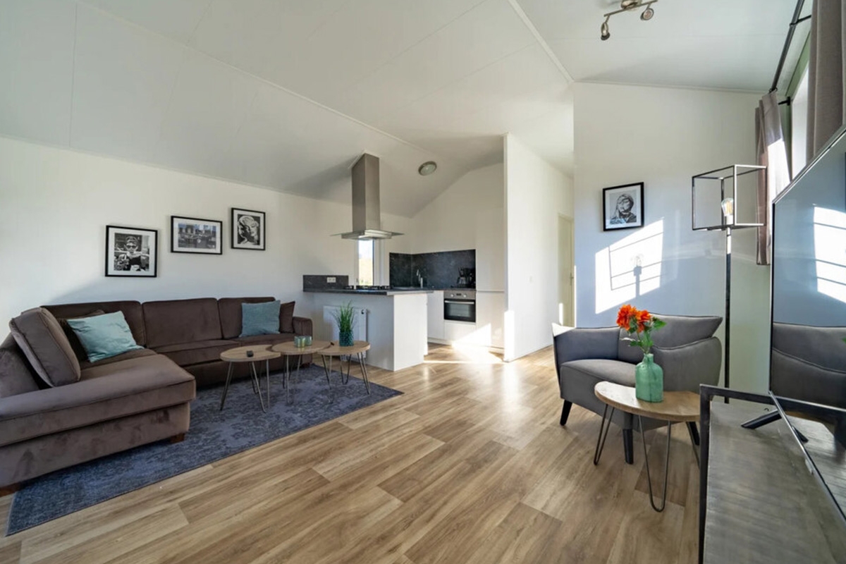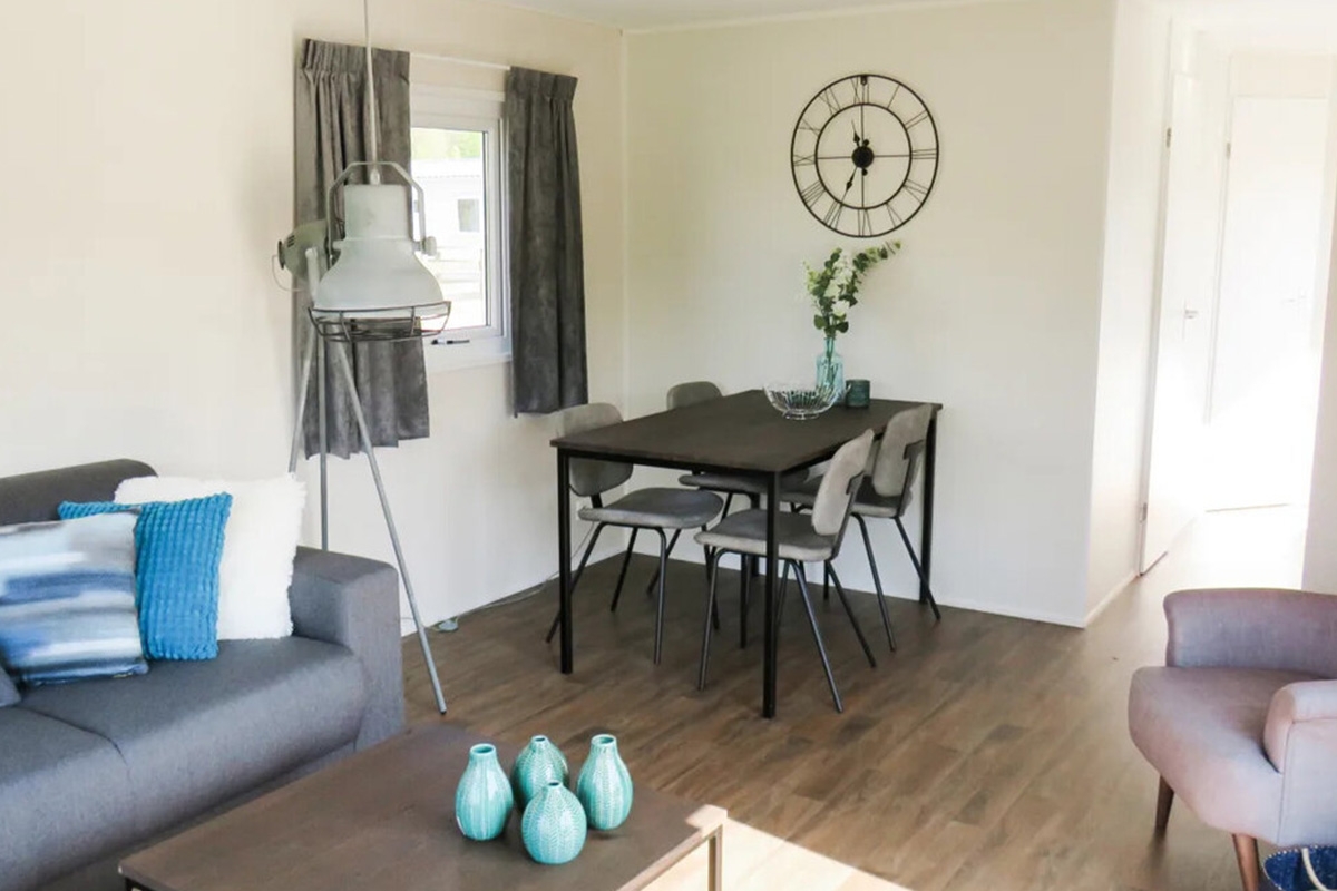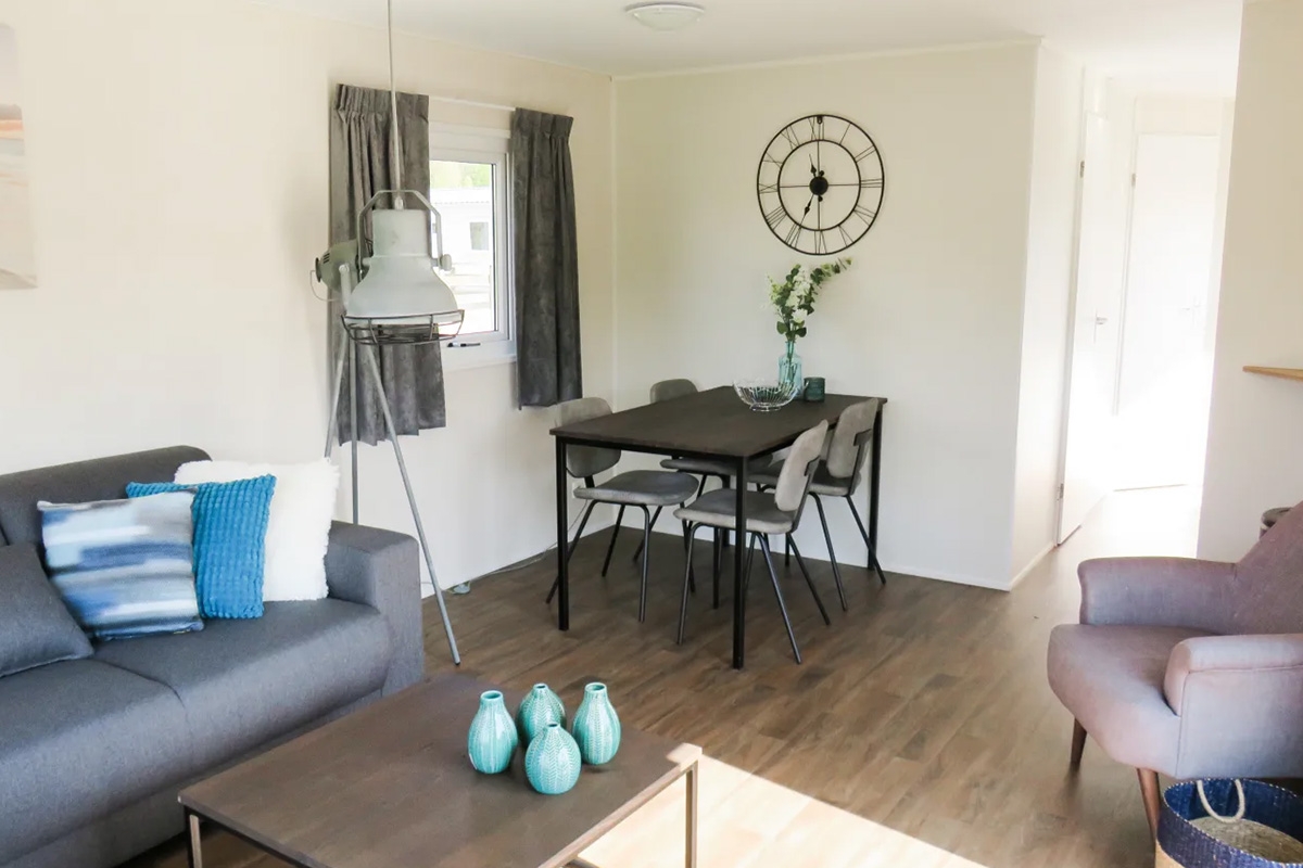 Het ruime chalet Deluxe 6 is geliefd om zijn sfeervolle en eigentijdse interieur. Het is vrijstaand, gelijkvloers en geschikt voor 6 personen. In de lichte en ruime woonkamer vind je een zithoek met televisie, een eethoek en een keuken met onder andere een filter koffiezetapparaat, combimagnetron en een vaatwasser. In totaal heeft het chalet 3 slaapkamers, waarvan 2 met 2 eenpersoonsbedden en 1 met een stapelbed. De badkamer is voorzien van een toilet, wastafel en douchecabine. De tuin heeft een terras met tuinmeubilair. Je kunt 1 auto parkeren bij Deluxe 6 en je kunt gratis verbinding maken met de Wi-Fi.