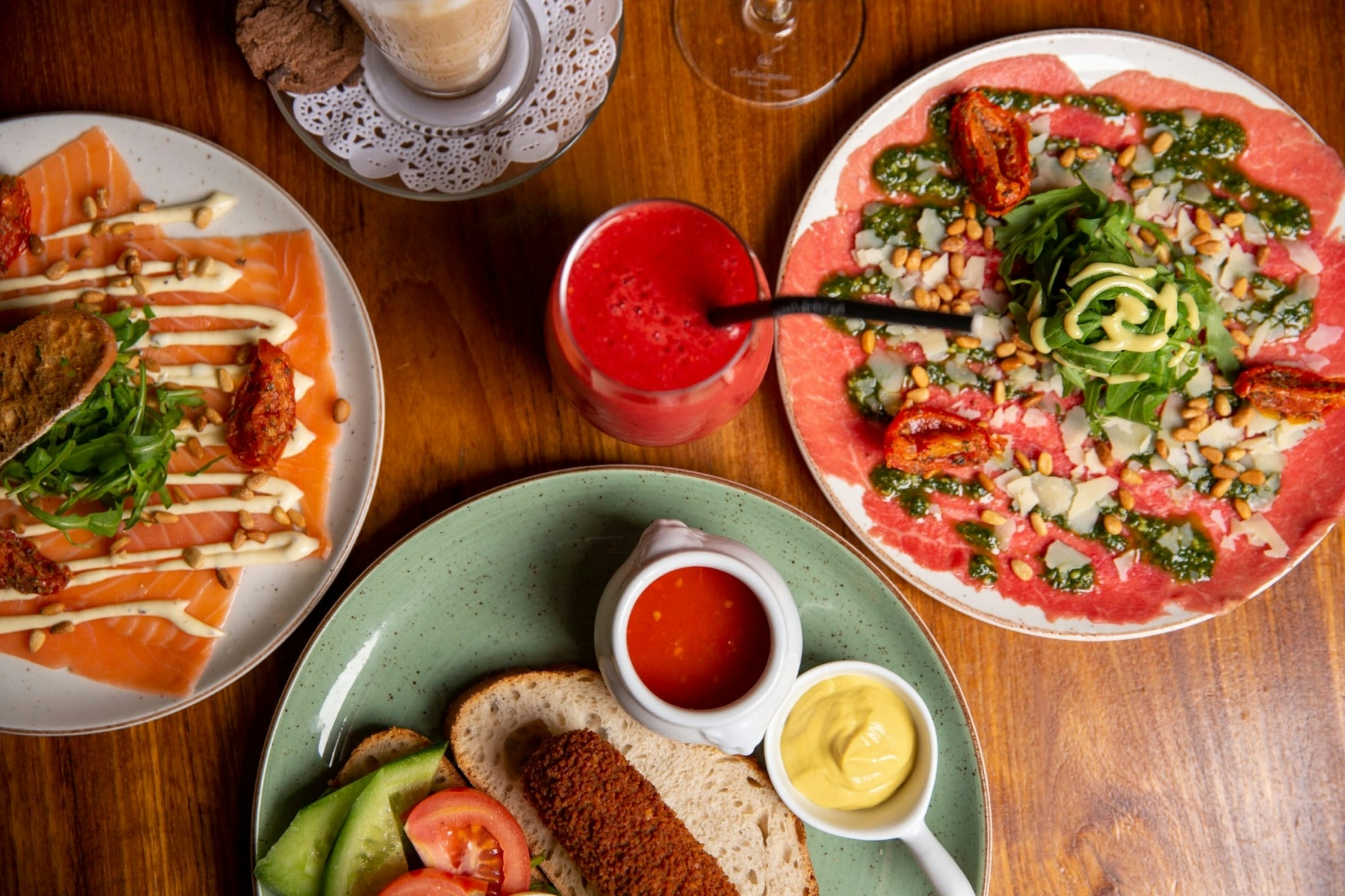 - Carpacciosalade - Carpaccio, pesto of truffel, pijnboompitjes, Parmezaanse kaas, zongedroogde tomaat (+€2,50)