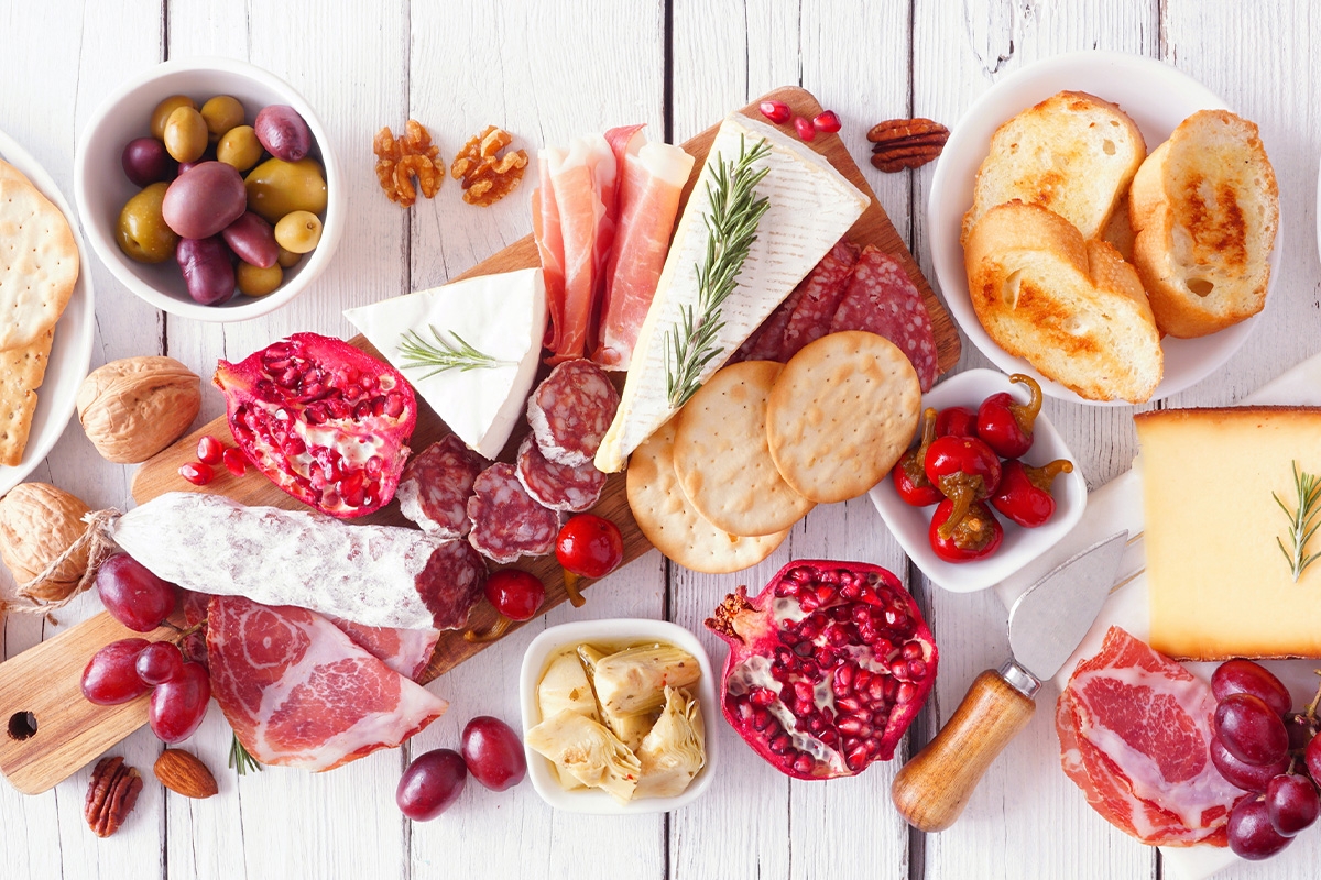 Met een mix van warme hapjes, brood met dips, tortillachips en koude hapjes zoals meloen, druiven, kaas en serranoham