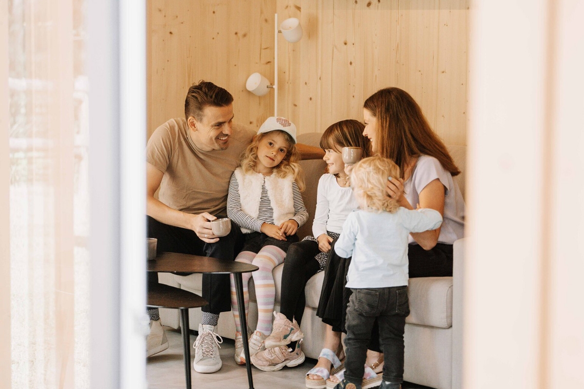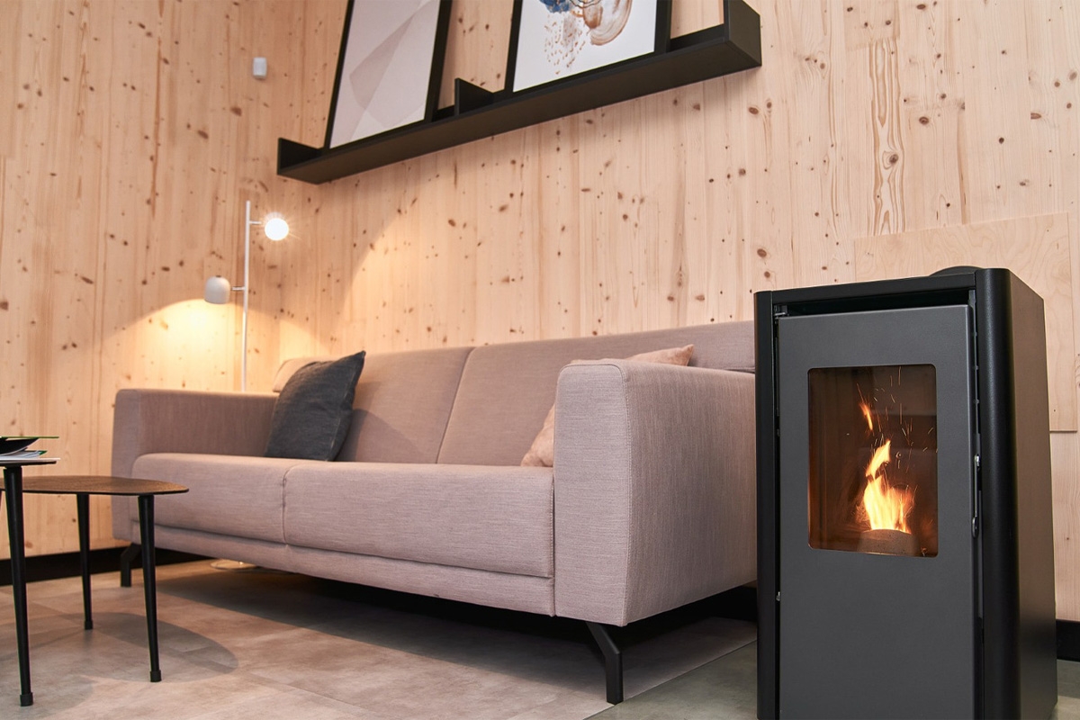 De woning heeft een gezellige woonruimte met zit- en eethoek, slaapbank en pelletkachel. Dankzij grote ramen heb je een mooi uitzicht op de natuur. De open keuken is volledig uitgerust met o.a. een vaatwasser, inductiekookplaat en oven.