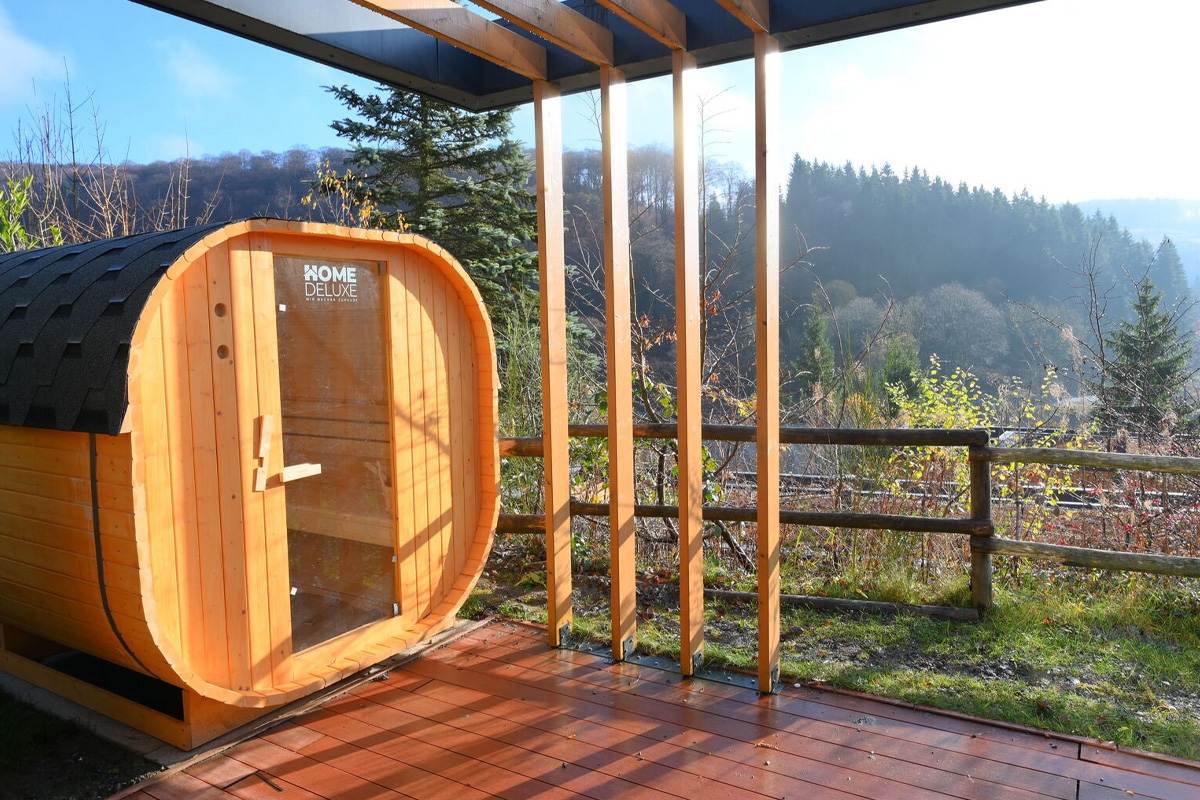 Buiten vind je een ruim terras met pergola, barbecue en sauna. Er zijn twee slaapkamers en een moderne badkamer met douche en Sunshower.