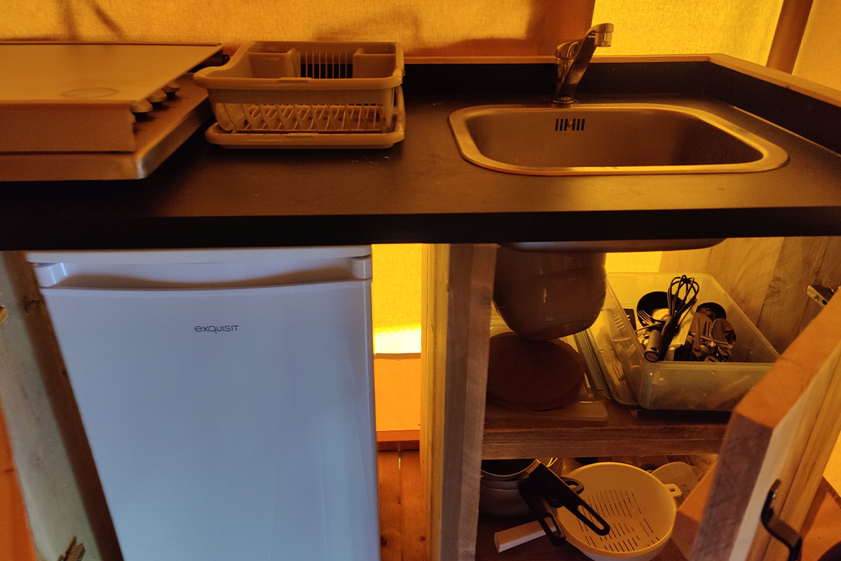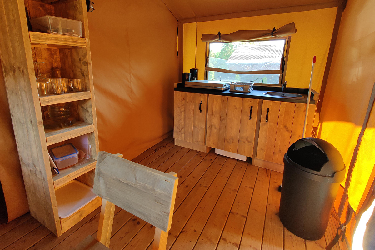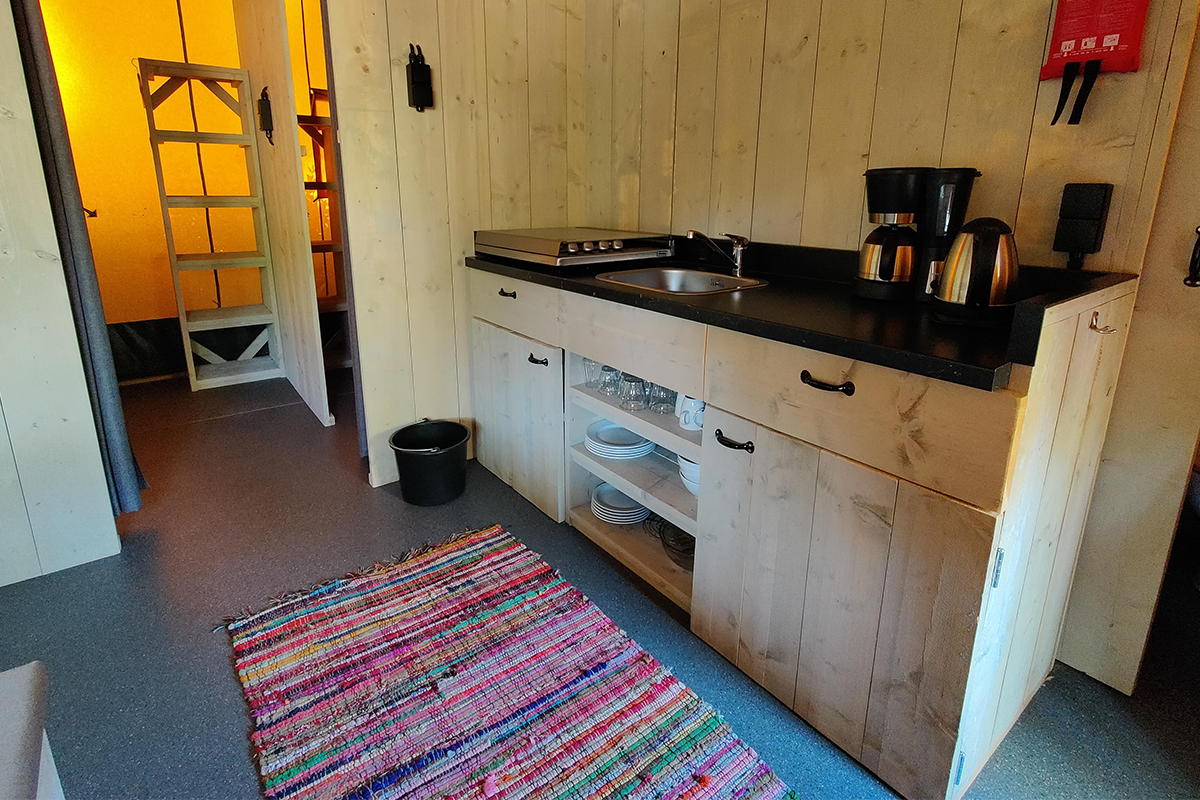 - Safaritent Comfort zonder sanitairvoorziening, met stromend water in de keuken (max. 5 personen)